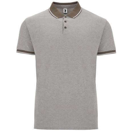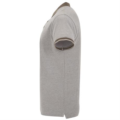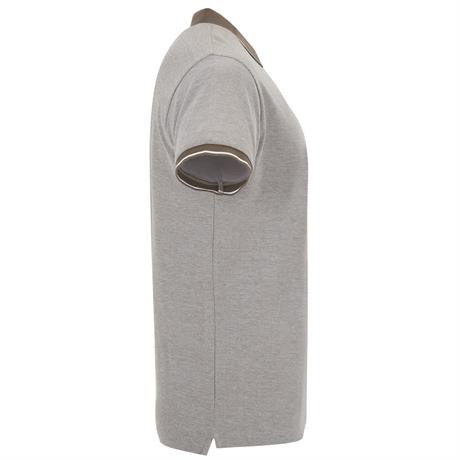 Футболка поло меланжевого цвета с короткими рукавами. Воротник и манжеты рукавов однотонного цвета в рубчик 1 x 1 с контрастной декоративной полосой. Внутренняя планка с декоративной контрастной лентой на три пуговицы. Вырез внизу по бокам с усиленными шв
