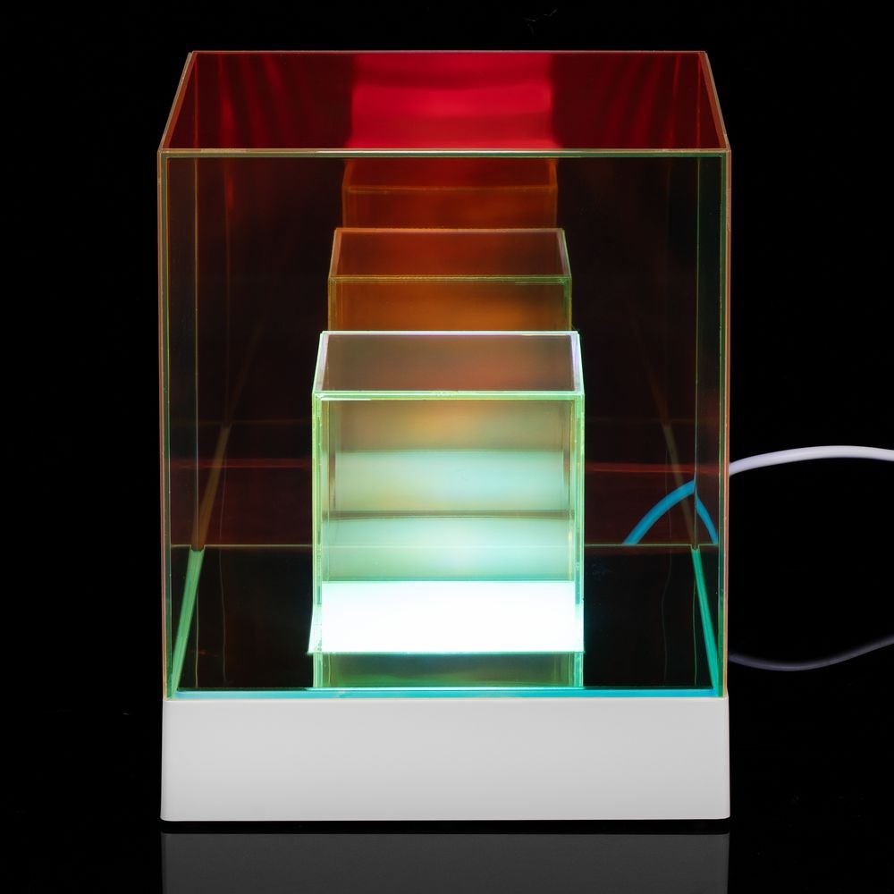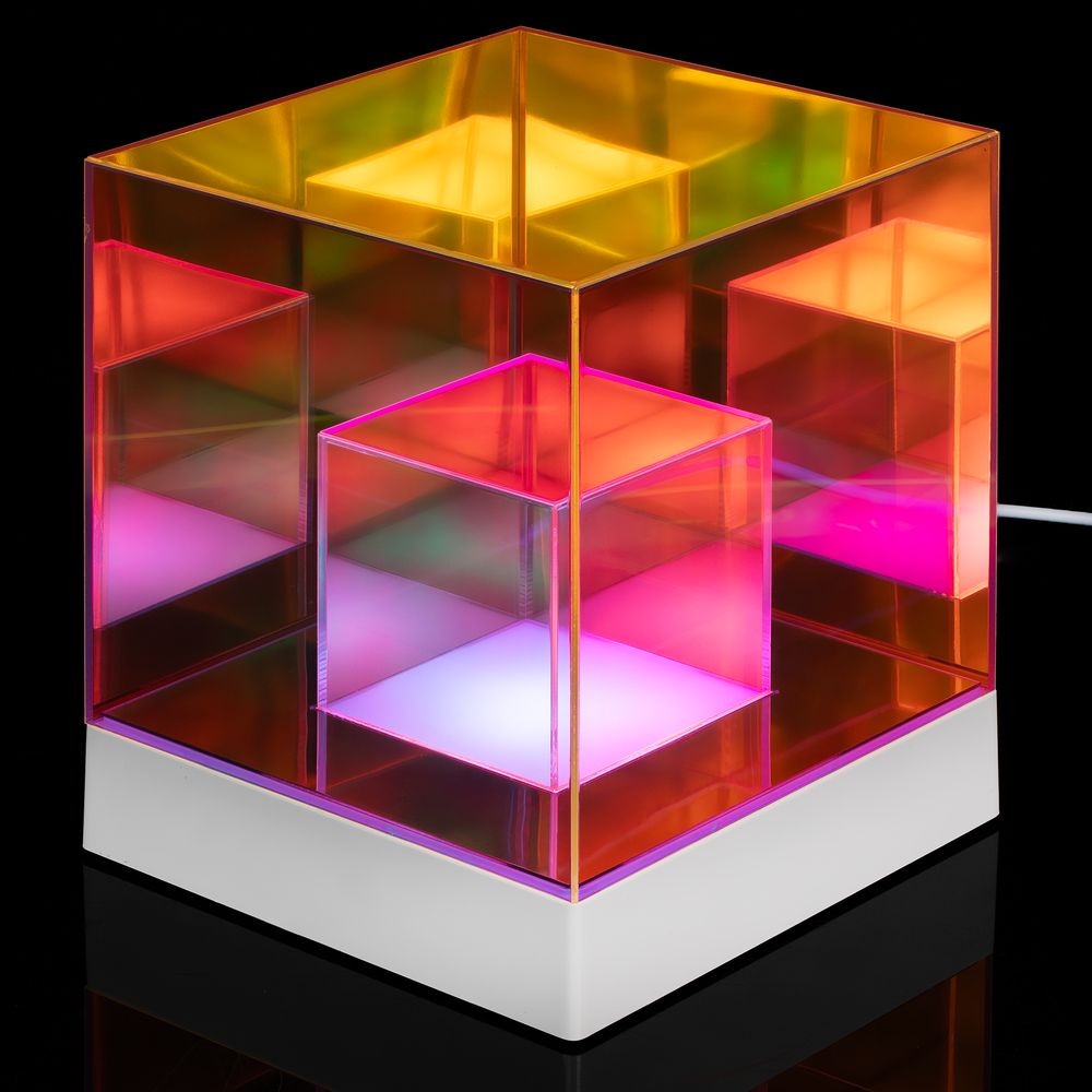 Cubini — интерьерный светильник с разноцветной подсветкой и удивительным оптическим эффектом. Разные оттенки граней и их множественные отражения мгновенно притягивают взгляд, заставляя рассматривать кубик снова и снова.Светильник можно использовать как ночную лампу или объект дизайна в интерьере. Яркость и тип подсветки регулируются при помощи пульта управления на кабеле.