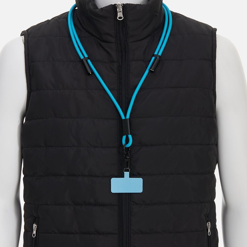 Важно: Для крепления телефона на ланьярд телефон должен иметь чехол. Если ланьярд распускается под тяжестью смартфона, убедитесь, что среднее из трех колец фурнитуры находится по центру ланьярда (на шее под затылком), а не сбоку. Соседние ветви оплетки должны идти вместе, без зазоров, так достигается трение ткани о ткань. Слишком тяжелые смартфоны (диагональ 6,9" и более) могут распускать ланьярд при энергичных движениях.