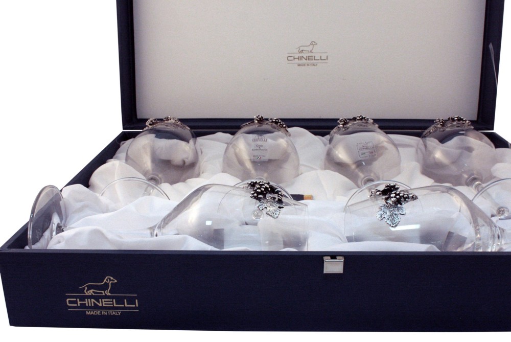 Набор бокалов для красного вина "UVA BLACK" в подарочной упаковке Chinelli (Италия): Материал: стекло, металл Размер: Длина: 24 см , Высота: 11 см В набор входит: 6 бокалов Производитель: Chinelli. Бокалы для вина – украшение стола. Если Вы задались целью купить бокалы для вина, то к выбору стоит отнестись серьезно. Красивые бокалы позволят подчеркнуть общую идею оформления, а также качество и вкусовые свойства напитка. Набор бокалов "UVA BLACK" станет прекрасным подарком как родным и близким, так и женщине - руководителю. Коллекция CHINELLI – это плавные линии, безупречное качество и оригинальный дизайн. Изящная отделка серебром делает каждый предмет идеальным украшением вашего интерьера. Марка CHINELLI это 40 лет бесценного опыта ручного производства, безупречного итальянского вкуса и европейского качества. Бренд воплощает в себе стиль и качество, соответствующий стандарту "Made in Italy". Компания расположена в долине Lumezzane провинции Brescia (Италия), которая с давних времен славится высоким мастерством в области обработки металла. На протяжении многих лет компания совмещает искусную работу ремесленников с промышленным производством. Характерной чертой CHINELLI является внедрение новейших технологий и способность быстро адаптироваться к изменчивости потребности рынка. Изделия марки CHINELLI с легкостью превратят встречу с друзьями в непревзойденную атмосферу праздника и уюта. Они отличаются безупречным качеством, роскошью исполнения и одновременно классической простотой стиля. Изделия изготавливаются из хрусталя, стекла, металла и даже фарфора, в декорировании используется покрытие серебром и золотом, инкрустация кристаллами Swarovski. Все изделия упакованы в фирменную подарочную упаковку с логотипом CHINELLI и сертификатом внутри.