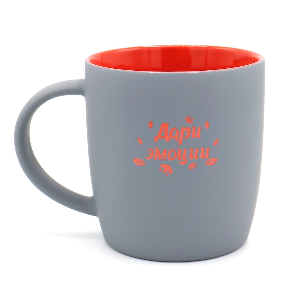 В кружке Spring под покрытием софт-тач слоя нанесен слой глазури такого же цвета, что и внутри; и при гравировке вы получаете яркое цветное изображение.