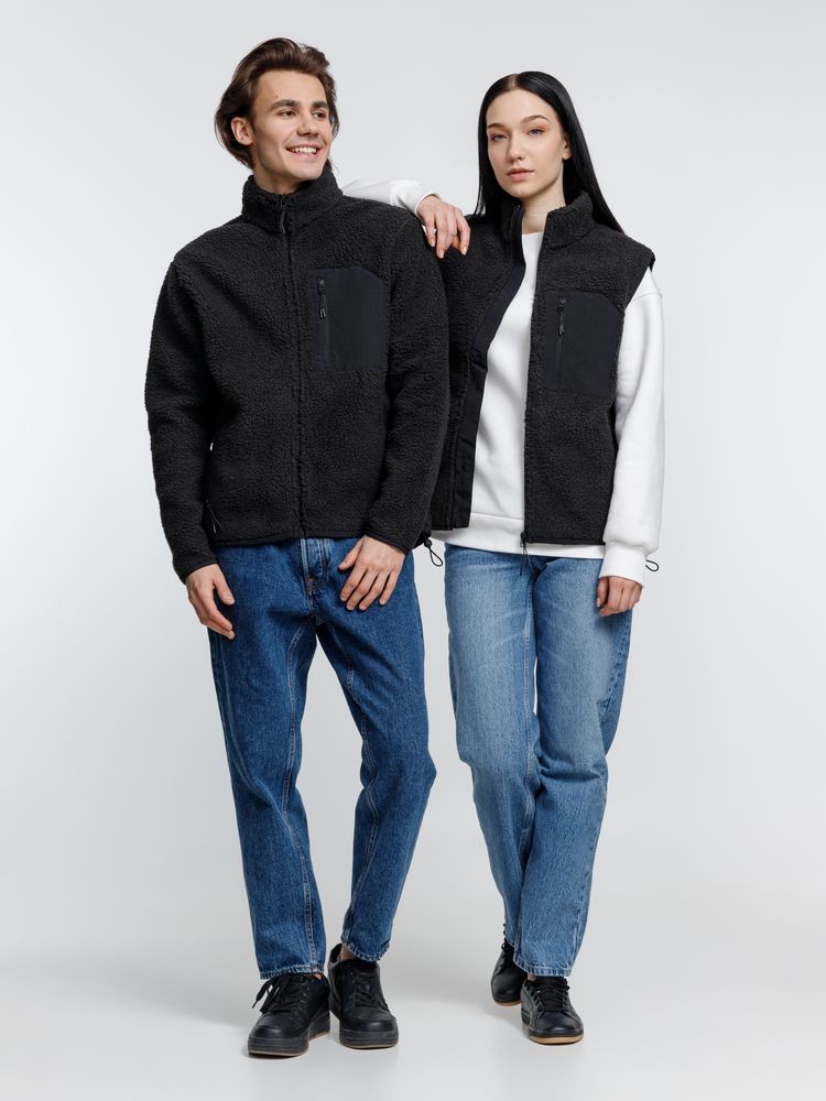 Куртка унисекс из фактурной искусственной шерпы с гладкой отделкой из таслана.