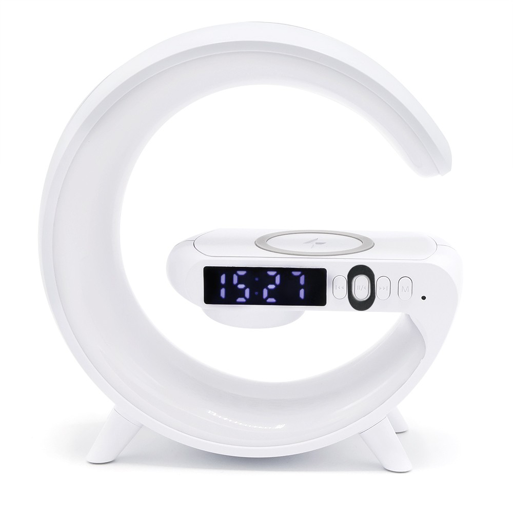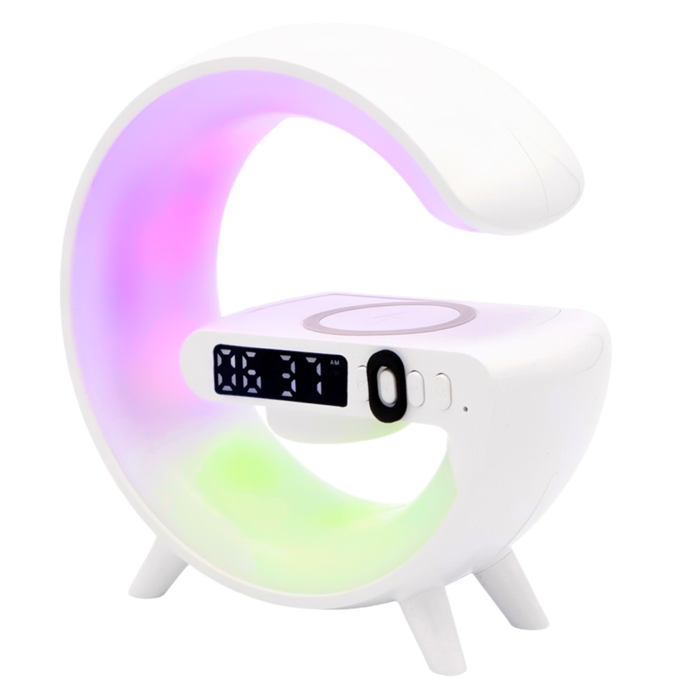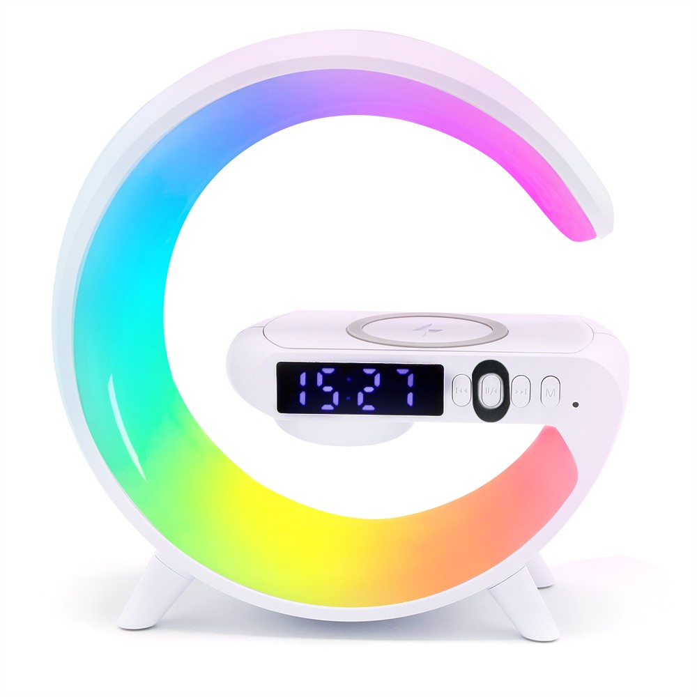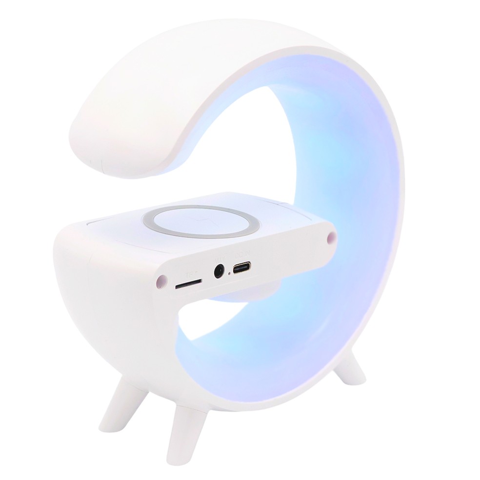 Беспроводная колонка с функцией беспроводной зарядки. Часы, будильник, RGB-подсветка, а так же защитная накладка на кнопке включения являются её особенностями. При остаточном заряде 10-20% подаётся предупреждающий сигнал. Размер: 155*55*160мм Bluetooth: v 5.2 Мощность динамика: 3W Батарея: 3.7V / 300 mAh Время работы: 2-3 Часа Время зарядки: 2,5 Часа Порт зарядки: Type-C Входное напряжение и ток: 5V/2A Беспроводное зарядное выход: 5W. Поддерживает все Android/Ios устройства с функцией беспроводной зарядки. Для работы беспроводной зарядки необходимо подключать устройство к сети через адаптер.