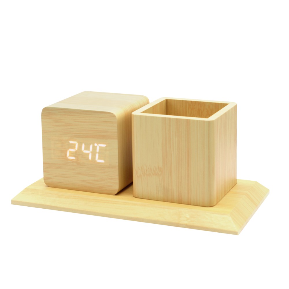 Многофункциональные деревянные часы с белой подсветкой и подставкой под канцелярские принадлежности. Функции: часы, дата, температура, 3 режима будильника, функция управления звуком (когда функция управления звуком активирована, дисплей гаснет через 15 секунд; вы можете активировать, дисплей хлопнув в ладоши, или слегка постучав по часам). В промежуток времени 18.00-7.00 яркость подстветски снижается на 50%. Источник питания: от сети, либо с использованием 3х батареек ААА (не входят в комплект). Поставляются вместе с русскоязычной инструкцией и USB кабелем для подключения к сети. Батарейки в комплект не входят.