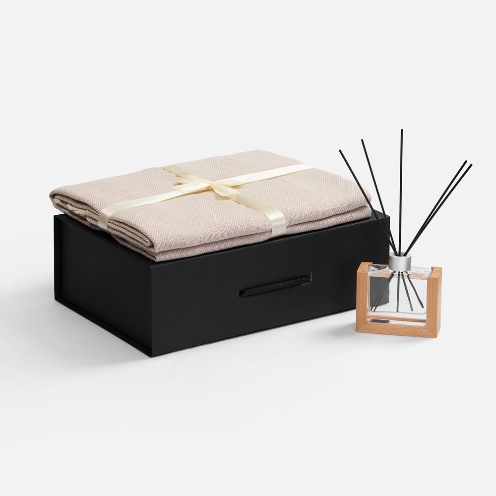 Материал: флакон - стекло, палочки из файбера; подставка для флакона - дерево; плед - хлопок 95%, полиэстер 5%, плотность 300 г/м²; коробка - переплетный картон, бумага Malmero