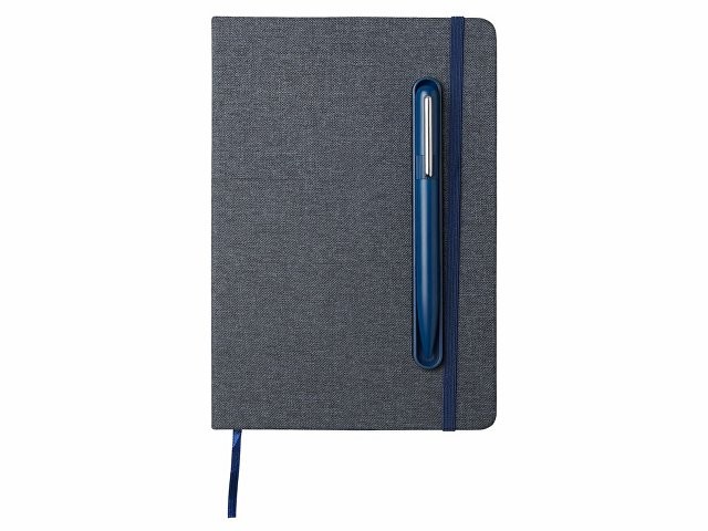 Блокнот в твердой обложке из rpet-пластика с металлической шариковой ручкой. В обложке магнитный держатель для ручки. Также верхняя часть обложки трансформируется в подставку для телефона. В блокноте 80 листов бумаги 70 г/м2.