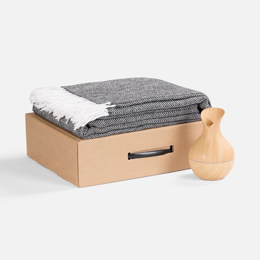 Мягкий плед нежных оттенков подарит тепло и комфорт, а изящный увлажнитель наполнит воздух свежестью и приятным ароматом. Этот набор — гармония красоты и функциональности, где каждый момент посвящен ценному отдыху и расслаблению.