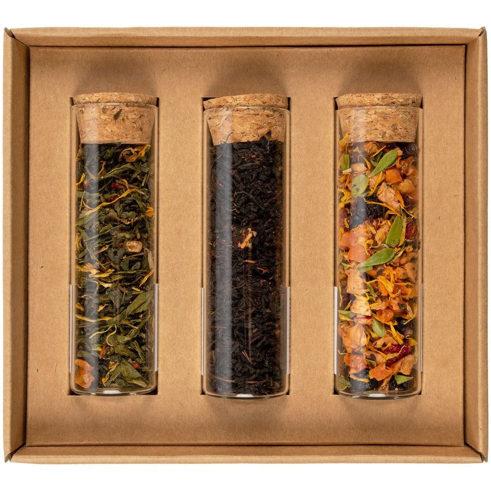 чай зеленый «Восемь сокровищ Шаолиня» (состав: сенча, зеленый чай ганпаудер, папайя, лепестки сафлора, лепестки календулы, ароматизатор «клубника»), вес 25 г; чай черный «Груша-гранат» (состав: черный индийский чай, сушеное яблоко, сушеные цветки граната, ароматизаторы «груша», «гранат»), вес 30 г; фруктовый напиток «Фруктовый мир» (состав: каркаде резанный, сушеное яблоко, ежевика сублимированная, облепиха сублимированная, смородина сублимированная, малина сублимированная, календула, плоды черноплодной рябины, кожура шиповника, лист брусники, цукаты «папайя», ароматизатор «малина», ароматизатор «вишня»), вес 40 г. Набор упакован в крафтовую коробку с ложементом.
