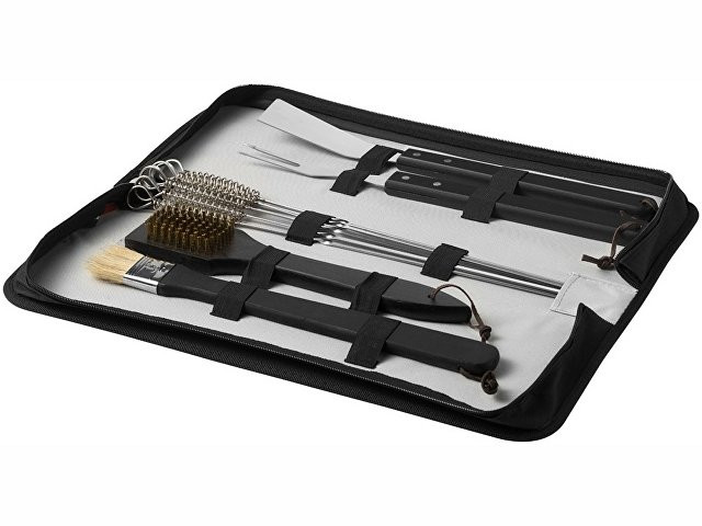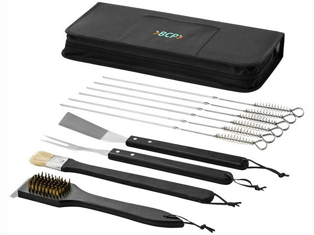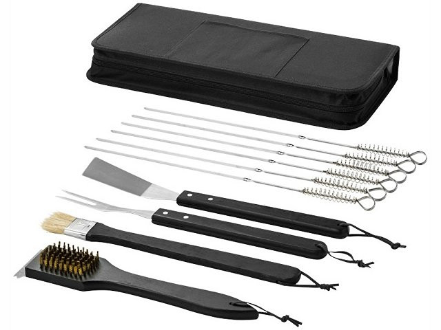 Набор для барбекю "Asado" из 11 предметов. Набор для барбекю включает лопатку для рыбы, кисть, вилку и щетку для очистки с деревянными ручками, шесть шампуров и чехол на молнии с передним карманом для нанесения. Нанесение не предлагается на отдельные элементы набора. Нержавеющая сталь и полиэстер 600D.