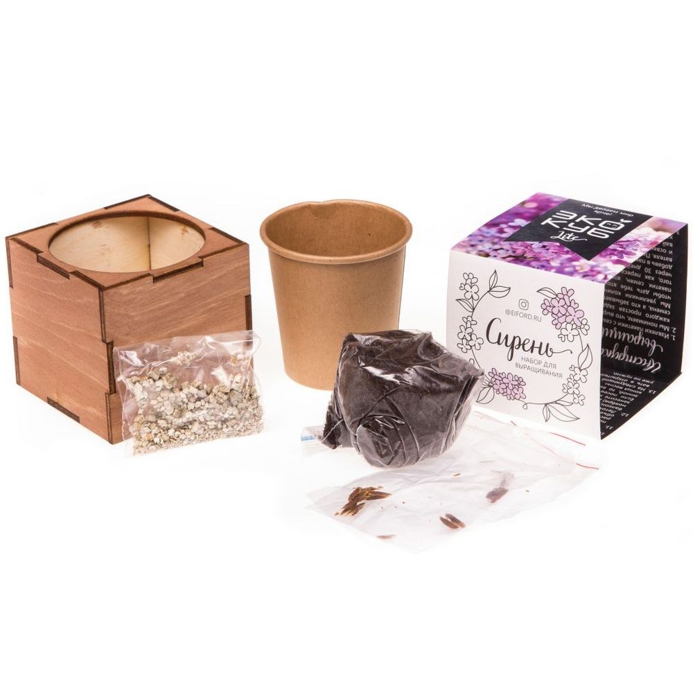 В наборе: деревянный куб, бумажный стаканчик, питательный грунт, семена, вермикулит.