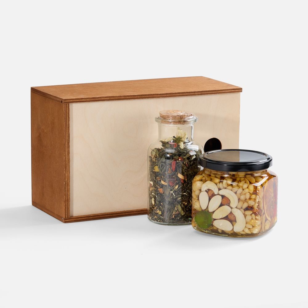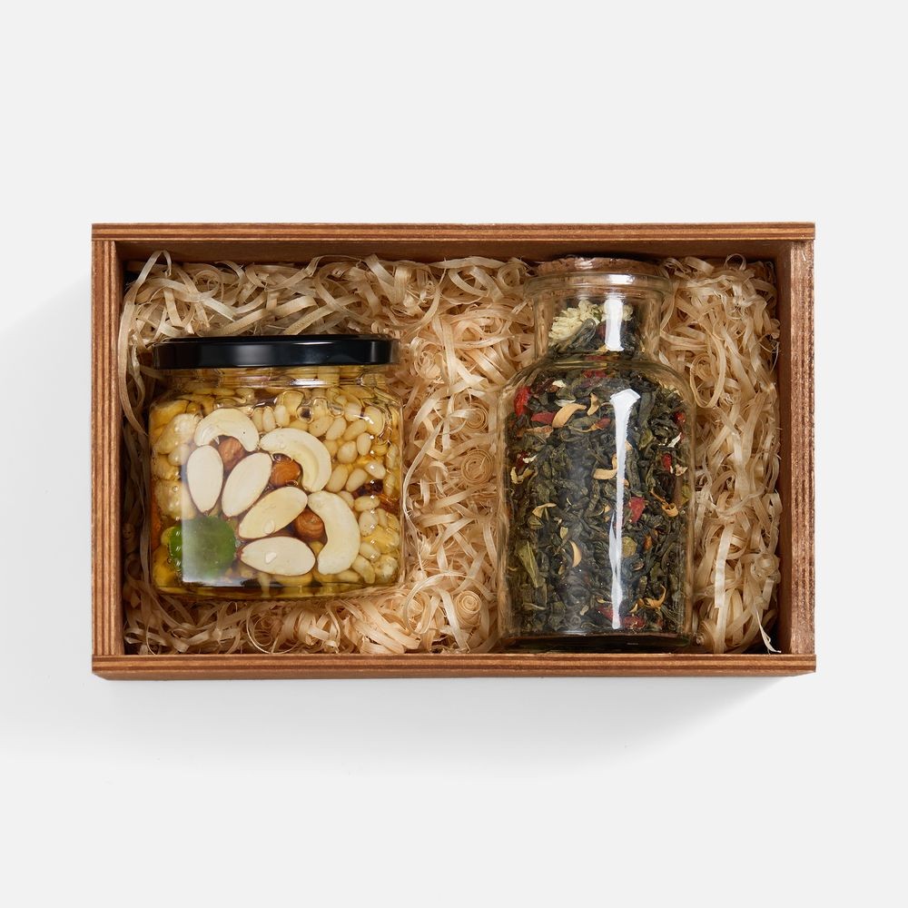 Насыщенный медовый десерт с хрустящими орехами, яркими цукатами и полезными семенами составляет идеальную партию зеленому чаю особого купажа, в основе которого нежные листья зеленого чая в обрамлении сладковатых нот кэроба и сушеного яблока. Ягоды годжи и сублимированная клубника дарят витаминную свежесть, а цветки хризантемы и апельсинового дерева — тонкий цветочный аромат.Идеальный выбор для утреннего пробуждения или освежающего перерыва в течение дня. Все эти вкусы бережно упакованы в деревянный ящик, что делает набор изысканным подарком для ценителей натуральных лакомств.