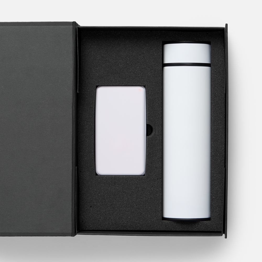 аккумулятор - пластик; покрытие софт-тач; термос - нержавеющая сталь, 304; покрытие софт-тач; коробка - переплетный картон