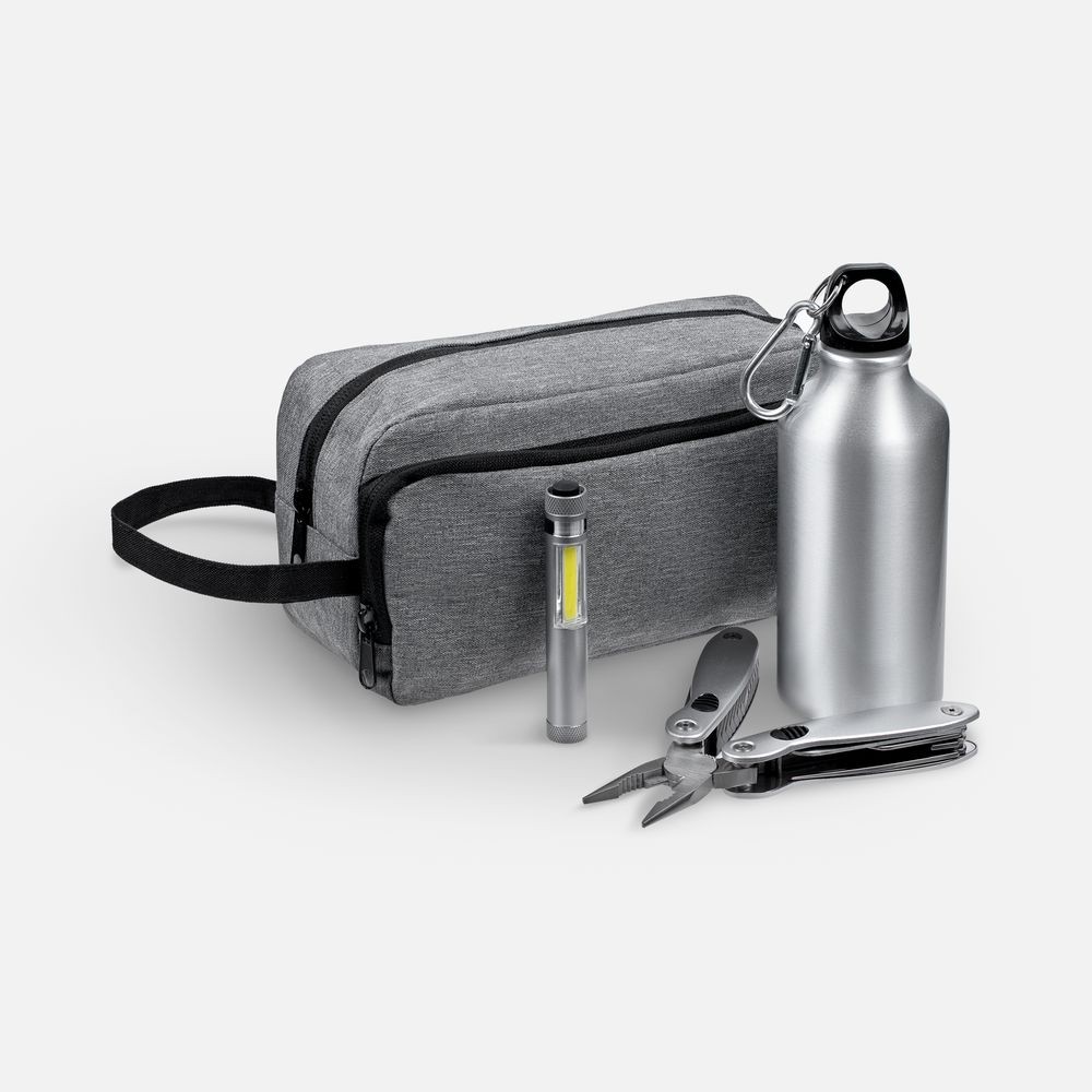 Материал: мультитул, фонарик, бутылка - алюминий; несессер - полиэстер
