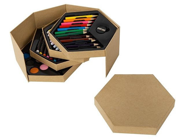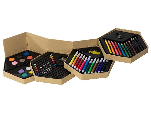 Расчет нанесенияНабор из 52 предметов для рисования. 12 маркеров, 12 цветных карандашей, 12 восковых карандашей, 12 акварельных красок, кисточка, точилка, резинка и большая скрепка.