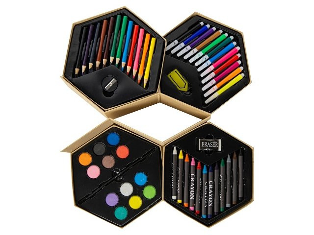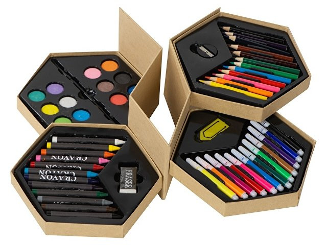 Расчет нанесенияНабор из 52 предметов для рисования. 12 маркеров, 12 цветных карандашей, 12 восковых карандашей, 12 акварельных красок, кисточка, точилка, резинка и большая скрепка.