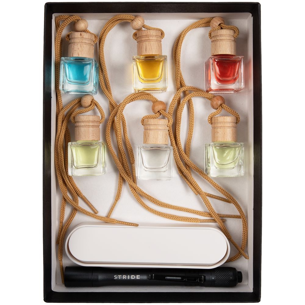 Материал: ароматизатор - стекло, дерево; коробка - переплетный картон; визитка - пластик; фонарик - алюминий
