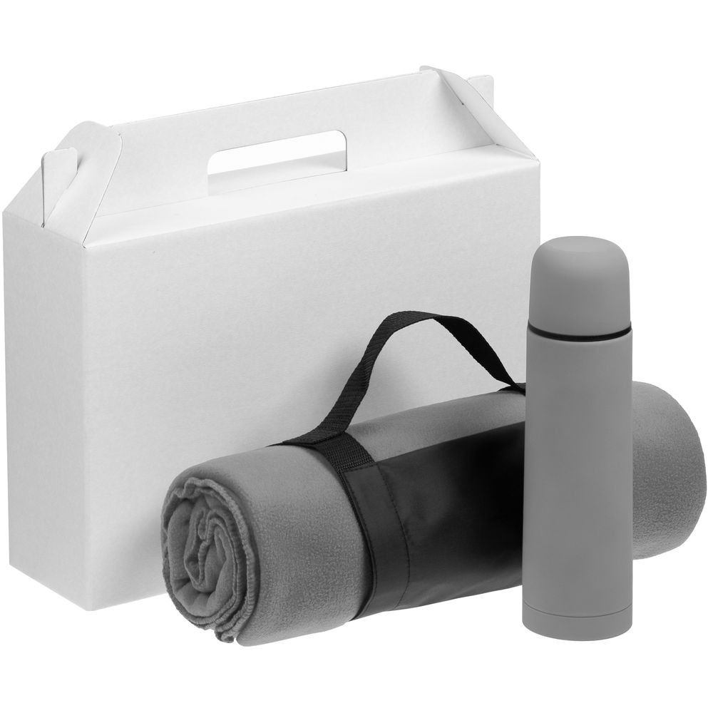 Материал: плед - флис, плотность 180 г/м²; термос - нержавеющая сталь, 304 внутри, 201 снаружи, пластик, покрытие софт-тач; коробка - микрогофрокартон