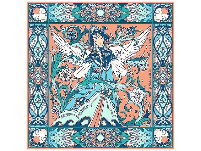 Платок «Царевна Лебедь» создан по мотивам сказочно-фольклорного мира А.С. Пушкина, где прекрасная Царевна воплощает добродетель, мудрость и чарующую красоту. Перевоплощаясь в птицу, она способна достичь небывалых высот и озарить мир своим великолепием.