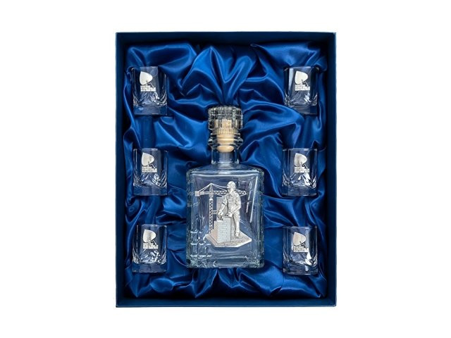 Подарочный набор со штофом «СТРОИТЕЛЬ». Традиционная для русского человека комплектация: элегантный графин емкостью 700 мл. с оловянным барельефом «СТРОИТЕЛЬ» и 6 стопок емкостью 50 мл. с оловянным барельефом «Мастерок». Материал барельефов: сплав с содержанием олова не менее 95%(пьютер). Художественное литье,чернение с эффектом антикварного серебра,полировка. Ручная работа. Подарочная упаковка «люкс» с атласным ложементом синего цвета.