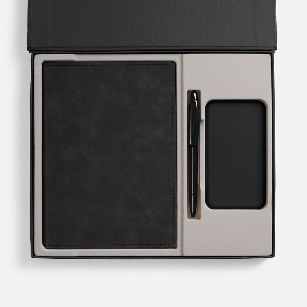 Набор с внешним аккумулятором позволит всегда оставаться на связи, а бессменная офисная классика — ежедневник и ручка — помогут направить энергию в правильное русло!