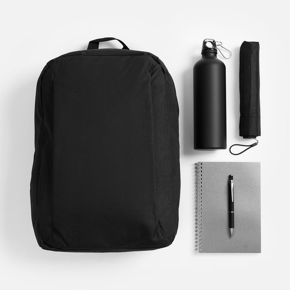 Материал: рюкзак - полиэстер, 600D; купол зонта - полиэстер, 300T; спицы - стеклопластик; ручка зонта - пластик, покрытие софт-тач; рама зонта, бутылка для воды - алюминий; блокнот - картон, бумага; пластик; ручка - металл, грип - пластик; покрытие софт-тач