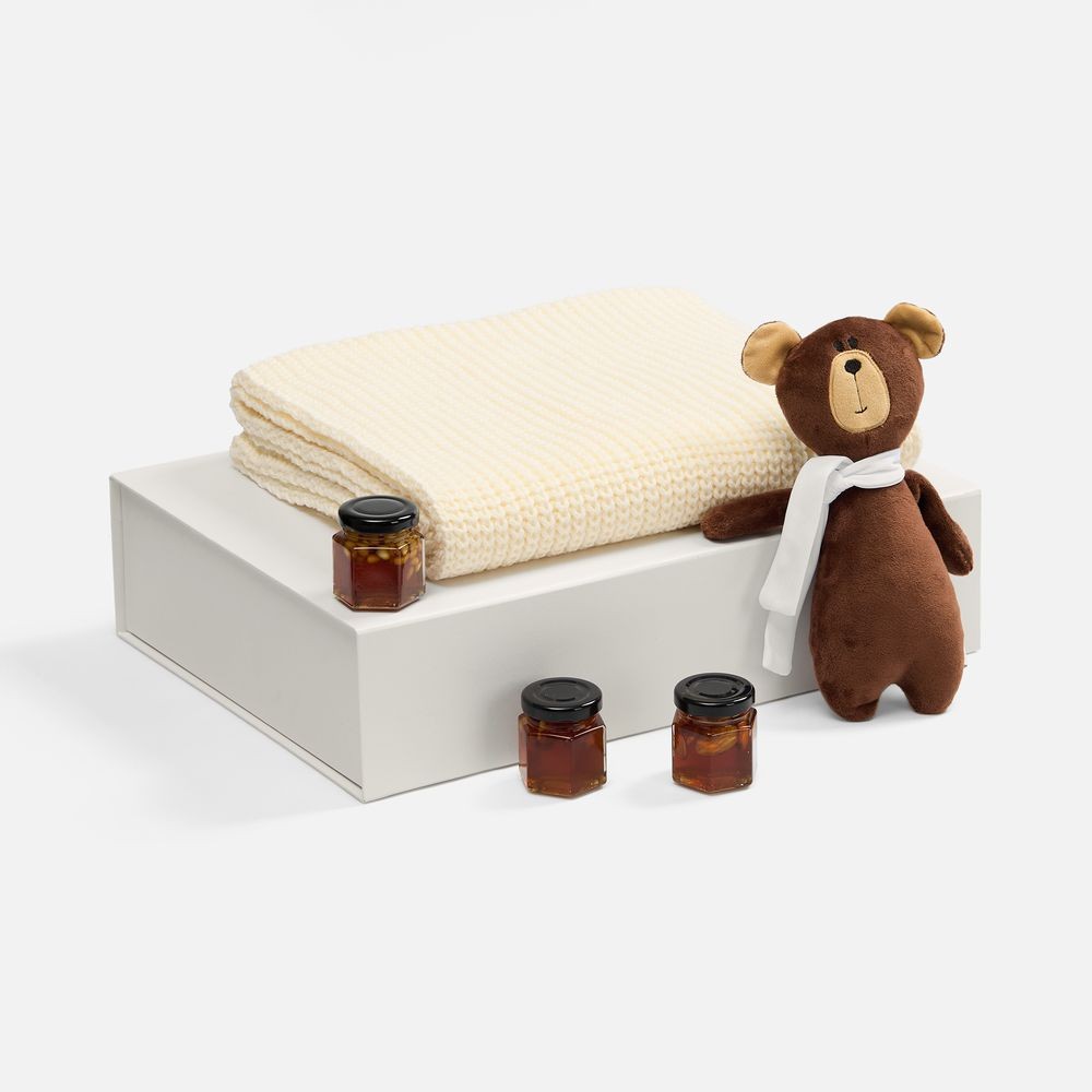 Милый мишка в шарфике с целой коллекцией разнообразного ароматного меда идеально дополняет основной, более практичный подарок — объемный шарф из толстой пряжи, который впишется в любой зимний образ.