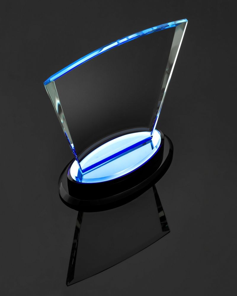 Стела изготовлена из стекла К9, в основе которого лежит оптическое боросиликатное стекло. Эту марку стекла отличает низкий процент посторонних включений, высокий показатель преломления и высокая прозрачность — идеальные качества для изготовления наград премиального уровня.