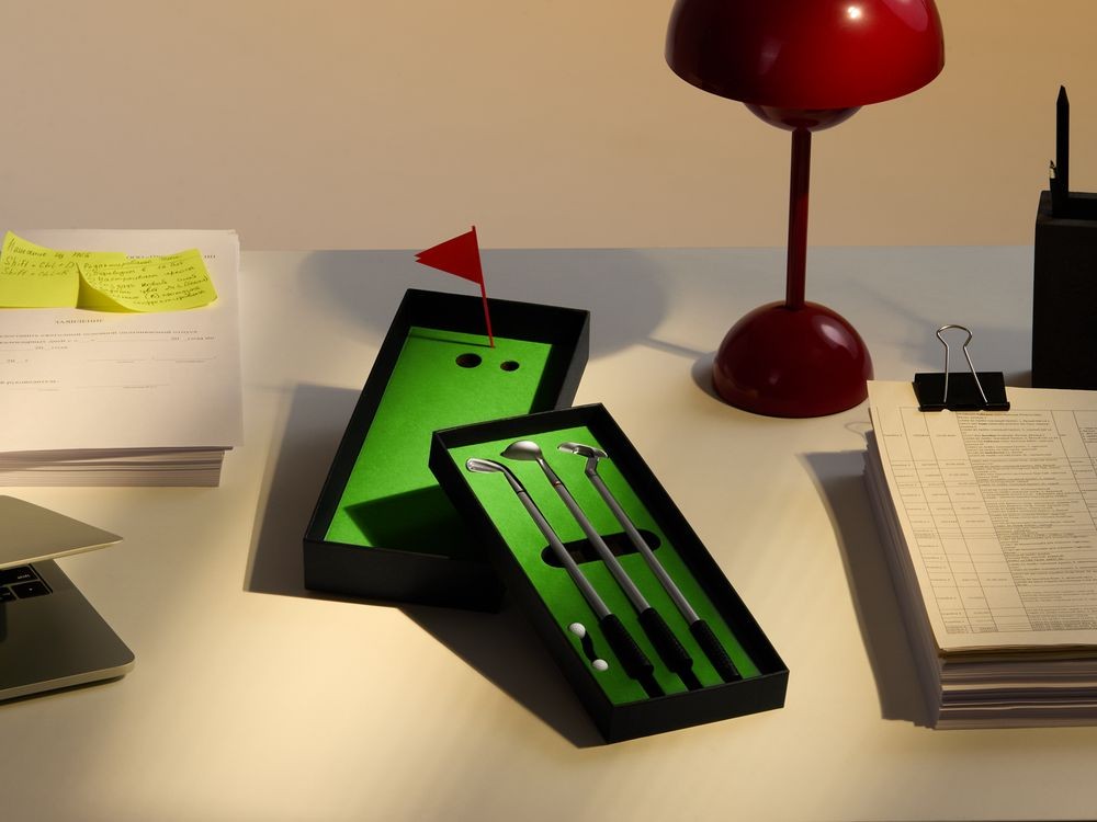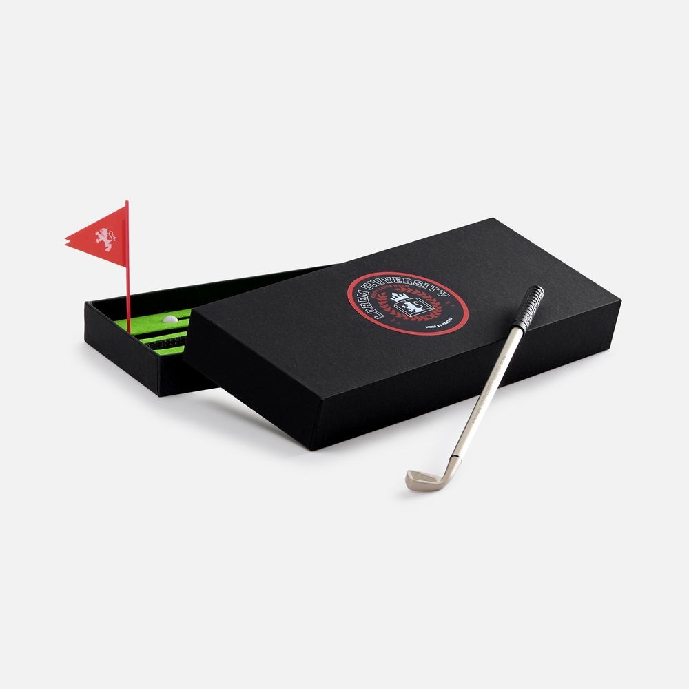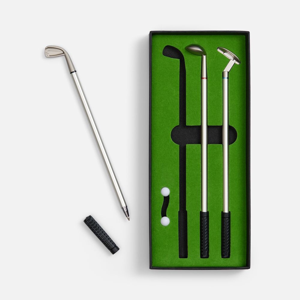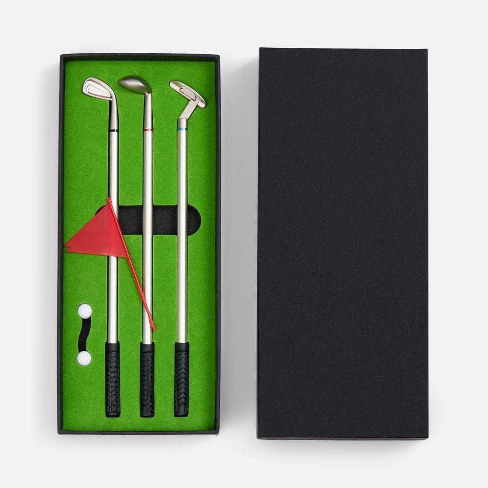В комплекте: 3 клюшки-ручки со сменным стержнем с синими, черными и красными чернилами, 2 мячика для гольфа, флажок и подарочная коробка.Не является детской игрушкой. Не предназначено для детей!Выдача заказов производится по адресу: ул. Республики, 83 офис 114.