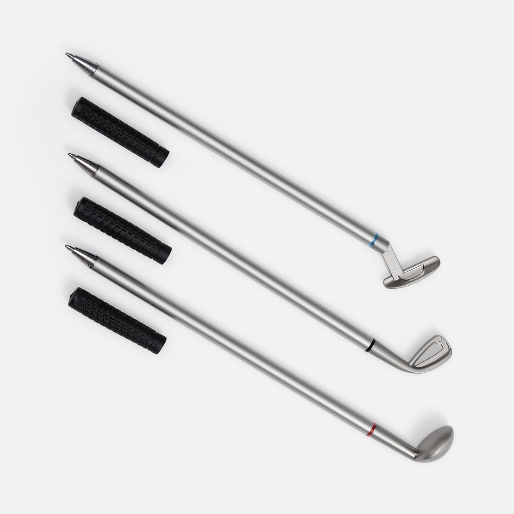 Без резиновых колпачков мини-клюшки превращаются в элегантные пишущие ручки, каждая со своим цветом чернил: черным, красным и синим.