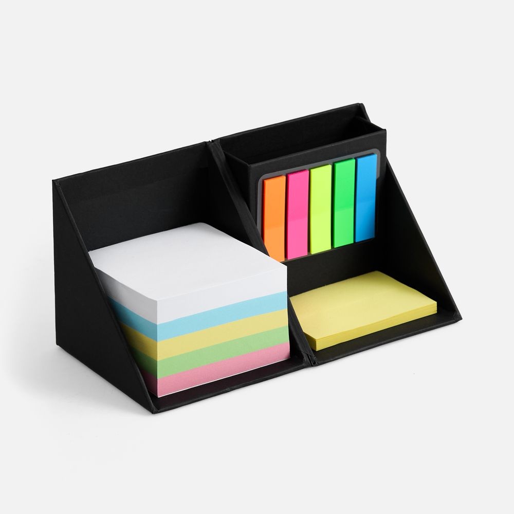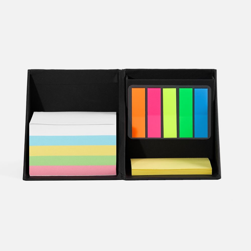 Блок бумаги: 500 листов, 5 цветов, плотность 70 г/м²; Блок листов с клейкой полосой: 50 листов; Пластиковые закладки: 5 цветов по 25 листов; Отделение для канцелярских принадлежностей. Поставляется в индивидуальном пакете.