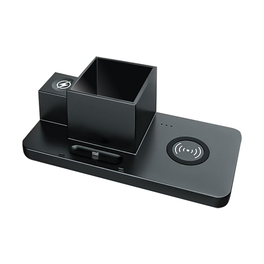 С настольным органайзером Medow вы всегда сможете поддерживать порядок на столе и заряжать свои устройства, не отвлекаясь от работы. Это идеальный аксессуар для современного офиса! Основные характеристики: ✔️ Материал: Пластик ABS, обеспечивающий долговечность и современный внешний вид ✔️ Мощность беспроводной зарядки: 15W, что позволяет быстро и эффективно заряжать ваши устройства ✔️ Разъем: Type-C, что обеспечивает универсальность подключения Настольный органайзер Medow предлагает три области для зарядки аксессуаров, а также удобную подставку для канцелярских принадлежностей. Это делает его идеальным помощником для организации рабочего процесса Технические характеристики: - Входное напряжение и ток:9v-1.6A/5V-2A - Выходное напряжение и ток:9v-1.6A/5V-2A - Мощность беспроводного зарядного:15W - Мощность беспроводного зарядного для часов:3W - Мощность беспроводного зарядного airpods:5W - Магнит: Да. Поддерживаемые устройства: 1) Область зарядки смартфона поддерживает все Android/Ios устройства с функцией беспроводной зарядки. 2) Область зарядки наушников поддерживает все Android/Ios устройства с функцией беспроводной зарядки. 3) Область зарядки часов поддерживает только устройства AppleWatch Для работы беспроводной зарядки необходимо подключать устройство к сети через адаптер.
