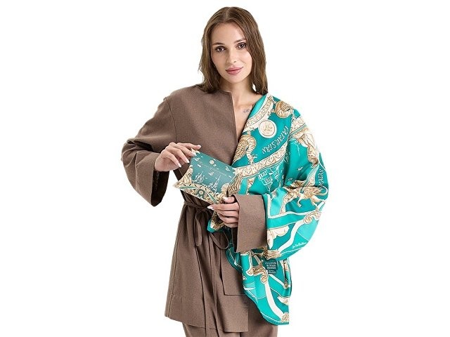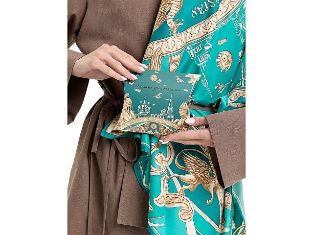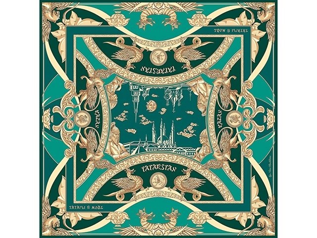 Казань – столица Республики Татарстан, «третья» столица Российской Федерации, один из крупнейших религиозных, экономических,образовательных, культурных и спортивных центров России. Казань-это город с богатой, многовековой историей, многообразие его культурного наследия привлекает туристов со всего мира! Столицу Татарстана традиционно называют «мультикультурной», здесь бок о бок соседствуют мечеть и православный храм, прослеживается смешение религии, ментальности и истории Востока и Запада. В центре композиции раскинулся величественный ансамбль легендарного Казанского Кремля, объект Всемирного наследия ЮНЕСКО, в составе которого отчетливо просматривается Мечеть Кул-Шариф, Благовещенский Собор и Башня Сююмбике. Панорама заключена в золотую рамку с татарским национальным узором, по углам которой мы видим образы любимой царицы казанских татар — Сююмбике и собирательный образ казанского Хана – символа доблести, отваги и мужества. Немаловажное место в общем решении платка занимает Коронованный дракон Зилант— официальный символ, изображенный на гербе города Казани. Крылатый барс как — Бог плодородия и покровитель детей, изображение которого присутствует на государственном гербе Республики Татарстан идеально вписывается в общую композицию. На платке барс изображен в виде золотой скульптуры, как и Зилант, это придает платку сказочности, волшебства и царственности. Над дизайном работали художники: Нина Ручкина, Александра Гринева.
