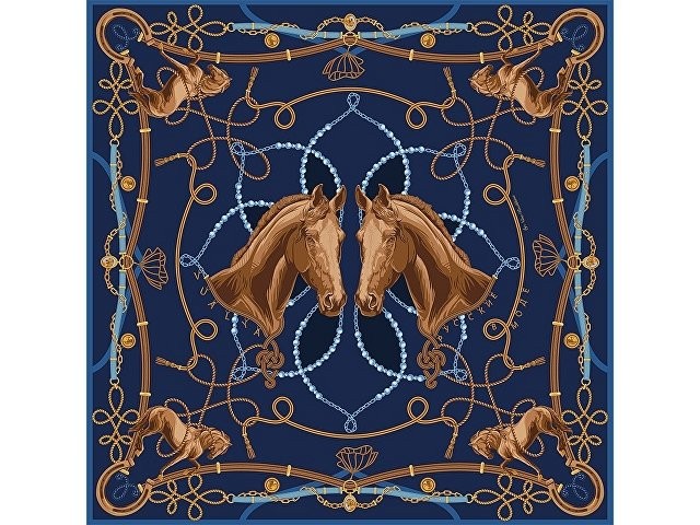 Платок «Конный клуб» вдохновлен духом русского аристократизма, тесно связанного с традициями верховой езды. Образ лошади, занимающий особое место в изобразительном наследии России, — от древнерусской миниатюры до современных шедевров живописи — ассоциируется с благородством, честью и внутренней силой. Платок воплощает эти возвышенные качества, отраженные в природной эстетике конного экстерьера. В центре композиции размещены стилизованные портреты лошади элегантной рыжей масти. Ощущение воздушной среды и размах открытых просторов переданы сочетанием светло-бежевых, золотых, голубых оттенков фона. Рисунок изящной амуниции образует ажурный декор с акцентными элементами, заключая изображение в эффектную рамку. Платок «Конный клуб» создан брендом «Русские в моде» совместно с маркой VUA-LYA, производителем одежды и аксессуаров. Платок станет изысканным атрибутом стиля или незабываемым прекрасным подарком! Над дизайном платка работали: Нина Ручкина, Ольга Данилова.
