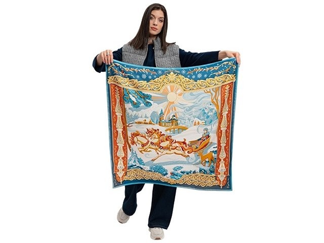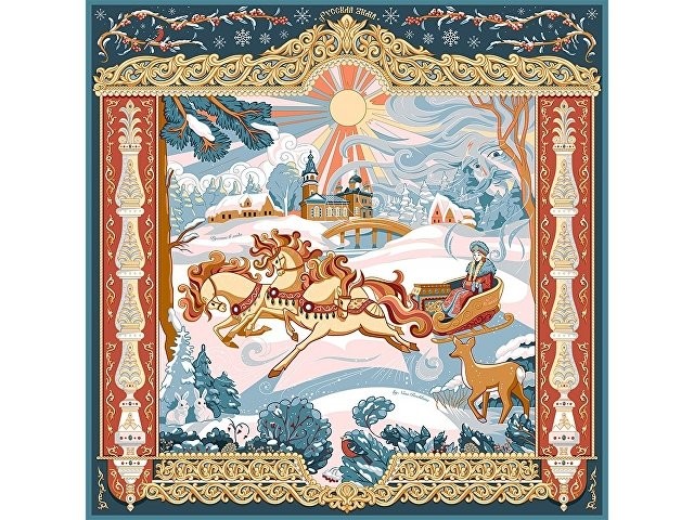 Русская зима, веками воспетая в искусстве, – чудесное время года, отражение национального характера и один из самых известных символов России. «Зимушка-зима», как ласково называли её на Руси, – пора рождественских праздников, домашнего уюта и тёплых встреч, великолепия преображенной природы. Это и долгий сезон крепкого мороза, формирующий знаменитые русские качества: стойкость духа, выдержку и смелость. Платок «Русская зима» воплощает фольклорный образ красавицы-зимы. Художественное пространство выстроено подобно книжной иллюстрации, где центральный сюжет раскрывается в обрамлении узоров по мотивам деревянного зодчества. Тройка лошадей, сани с красной девицей, стилизованный облик Деда Мороза или Морозко, ели, припорошенные снегом, в окружении добрых лесных зверей, – наполнены глубоким символизмом и создают атмосферу волшебства. Православные церкви среди пышных сугробов, озаренные яркими солнечными лучами, знаменуют торжество веры, возрождения и любви. Платок «Русская зима» создан совместно с Ассоциацией МАКО. Автор идеи — Анна Ревякина. Мы желаем прекрасной обладательнице платка «Русская зима», вдохновлённого традициями великой России, безграничного счастья и исполнения всех желаний! Над дизайном работали: Нина Ручкина, Анастасия Погодина, Анна Ревякина.
