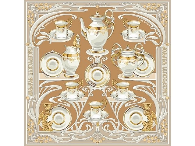 Композиция платка словно сказочный лабиринт увлекает за собой, вызывая желания рассматривать детали утонченного сервиза работы уральских мастеров. Изящные фарфоровые предметы расположены в ажурном серванте эпохи модерна.