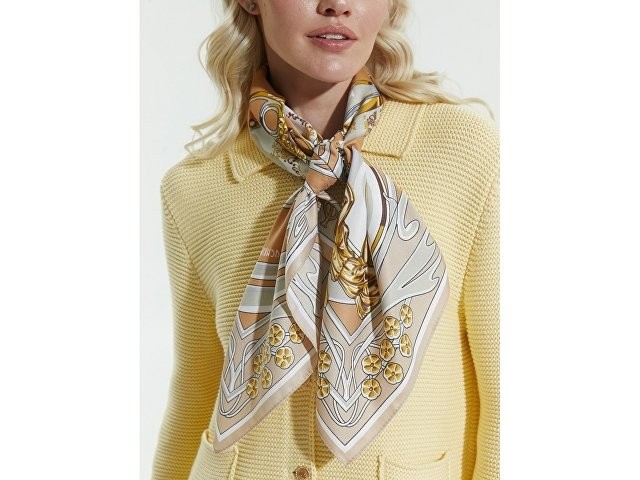 Сочетания благородного золота и слоновой кости, плавные линии и стилизованные цветы рождают необычайно элегантный дизайн авторского аксессуара. Такой платок привнесет дополнительный шик как в базовый гардероб, так и в вечерний стиль.