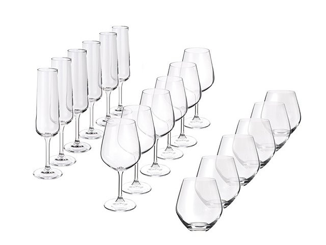 Набор бокалов состоит из 18 предметов - из шести бокалов-флютов для игристых вин, из шести бокалов для красного вина и из шести бокалов без ножки для разных видов напитков, в частности, для коктейлей. Все бокалы выполнены из бессвинцового хрусталя, экологически чистого материала, который сохраняет кристальную прозрачность, не тускнея и не мутнея. Лаконичная классическая форма бокалов, выполненных в едином стиле с учетом строгих канонов посуды для вина, которые помогают напиткам раскрыть свой вкус и аромат в полной мере, не менее хорошо подходит и для нанесения логотипа. - для игристых и тихих вин - три вида бокалов в сете - материал — бессвинцовый хрусталь, который сохраняет свою прозрачность долгие годы - идеален для нанесения логотипа — лаконичный дизайн бокалов выступит стильным фоном для брендирования