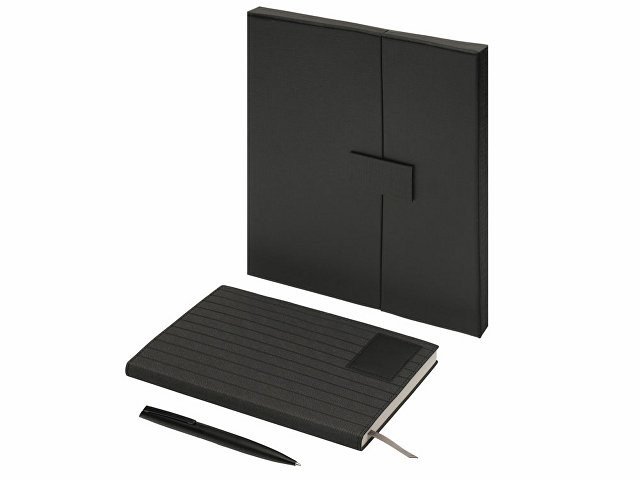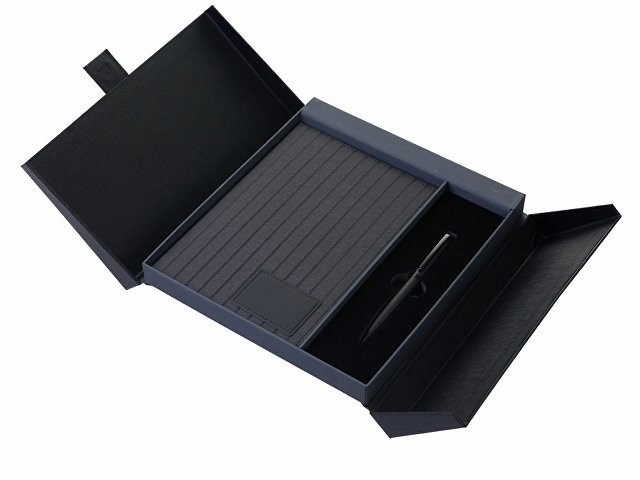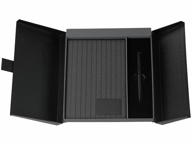 "Bradbury & Co" - это элегантный подарочный набор, упакованный в красивую коробку на магните. Внутри — блокнот в обложке из рифленой экокожи и металлическая шариковая ручка. Ручка гармонирует с блокнотом за счет рифленой нижней части, а блокнот имеет специальный патч для нанесения логотипа (который можно также нанести на более ровную поверхность на обороте блокнота) и ляссе-закладку для удобства. При гравировке на ручке вскрывается эффектный серебристый цвет.