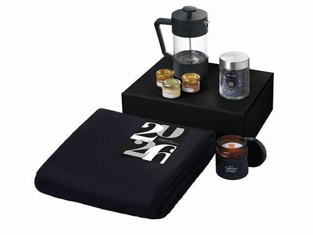 Подарочный набор c пледом, френчпрессом, чаем и медом, черный