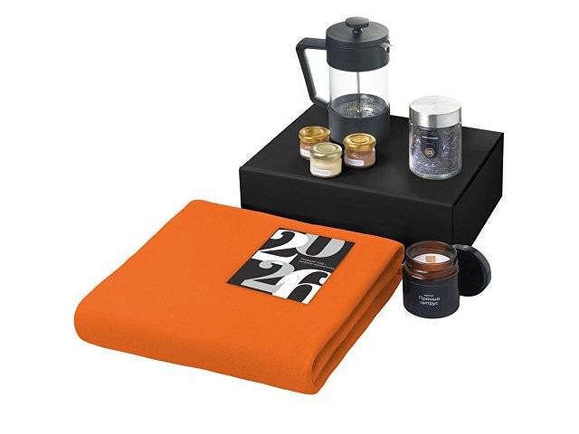 Подарочный набор c пледом, френчпрессом, чаем и медом, оранжевый