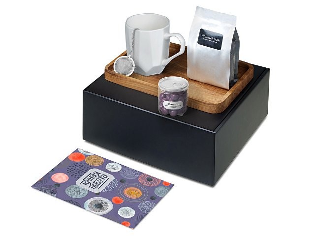 Материал: кружка - костяной фарфор, чай - пластик, ситечко для чая - нержавеющая сталь, поднос - дуб, мешок - нетканый материал (спанбонд), коробка - картон