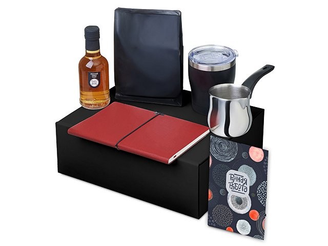 Материал: сироп - стекло, блокнот - искусственная кожа, бумага, турка - нержавеющая сталь, бакелит, кофе - пластик, термокружка - нержавеющая сталь, керамика, полипропилен, мешок - нетканый материал (спанбонд), коробка -картон