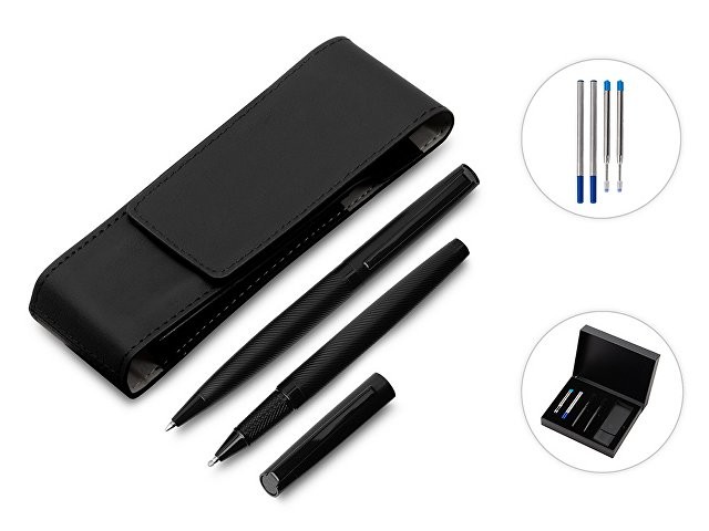 В набор входят шариковая ручка и роллер. Швейцарский пишущий узел Premec и немецкие чернила Dokumental обеспечивают мягкое и плавное письмо. Корпус каждой ручки имеет анодированный слой, благодаря которому гравировка получается с зеркальным эффектом.В набор входит также пенал для двух ручек, который также можно брендировать.