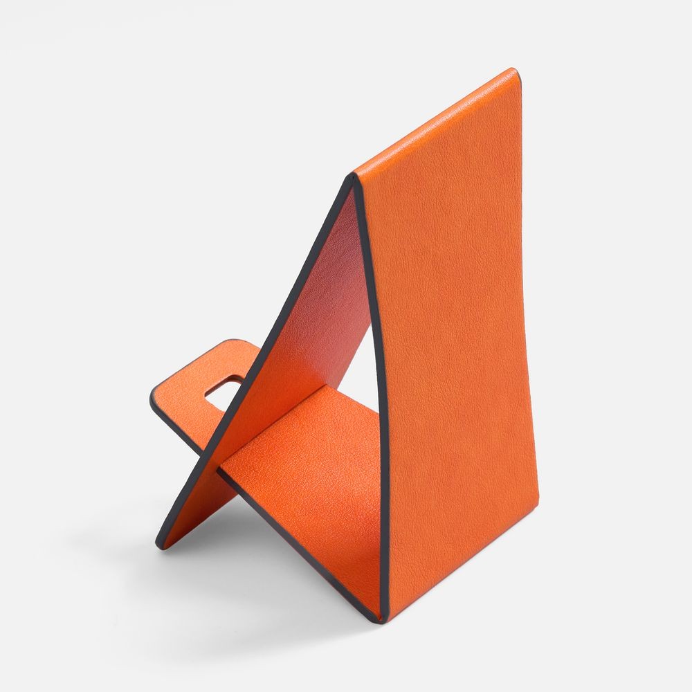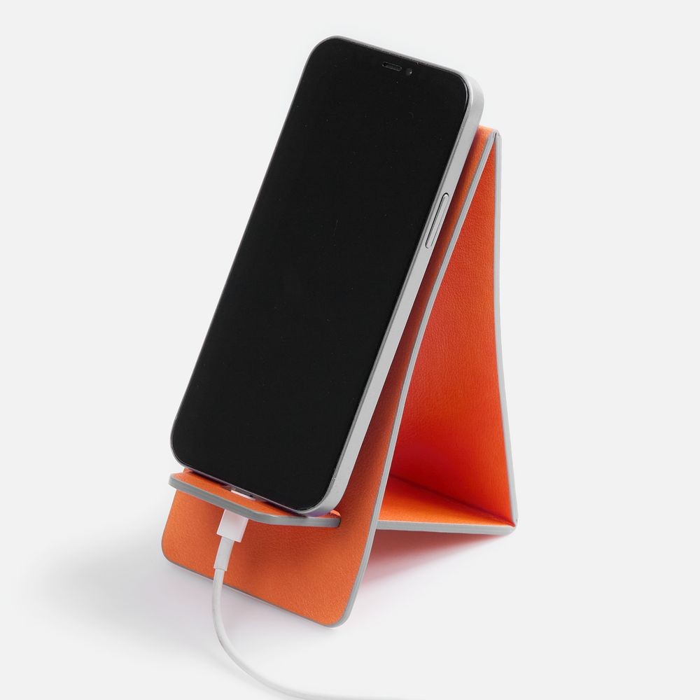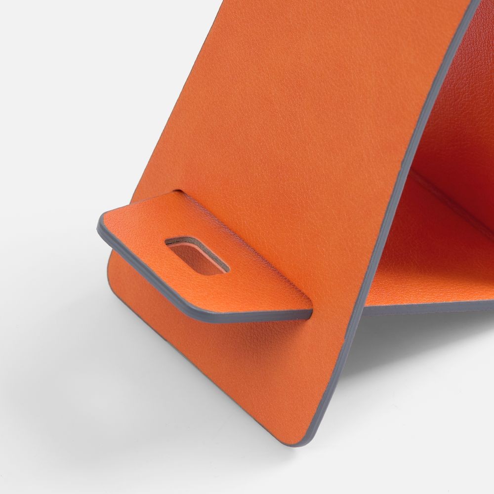 Складная подставка для телефона с вырубкой под шнур зарядного устройства. Выполнена из материала Petrus.