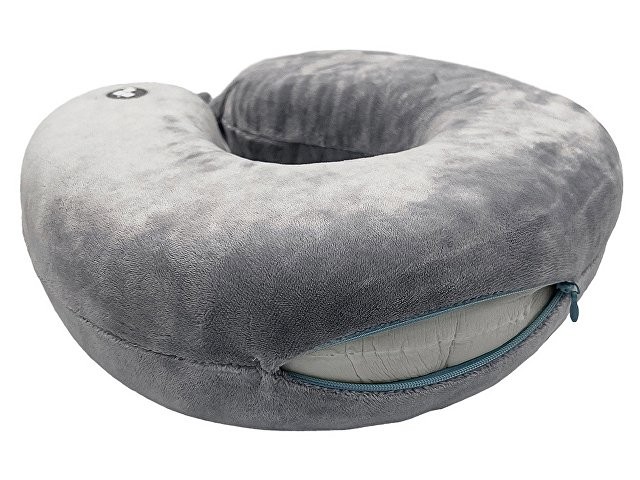 Удобная кнопочная застёжка надёжно фиксирует подушку на шее, а в комплект входит прочный круглый чехол на молнии — для компактного хранения и перевозки.