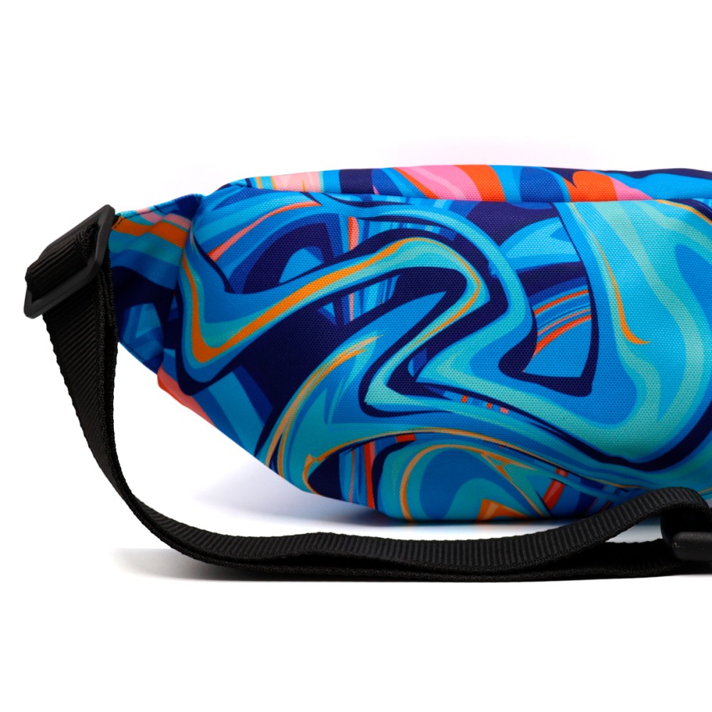 Полноцветная печать по всей поверхности от шва до шва. Возможны любые оттенки по CMYK: логотипы, надписи и разнообразные принты. Односторонняя сублимация. Вместительная модель с двумя отделениями. Регулируемый поясной ремень на защёлке-фастексе.