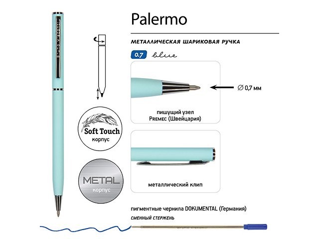Автоматическая металлическая ручка "Bruno Visconti" серии "Palermo" однотонного цвета порадует любителей всего изящного и утонченного. Покрытие корпуса Soft Touch гарантирует дополнительный комфорт в работе с ней. Стержень легко выдвигается благодаря поворотному механизму. Синие пигментные чернила Dokumental (Германия) и пишущий узел Premec (Швейцария) обеспечивают качественное и мягкое письмо.