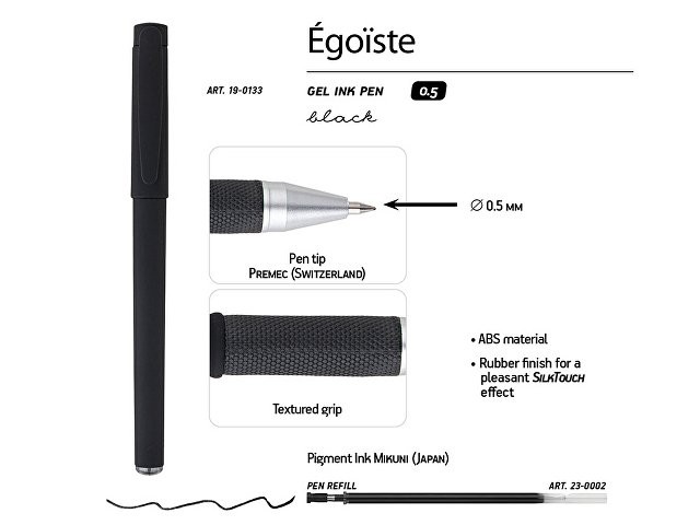 Линия гелевых ручек Egoiste выпускается в эргономичных округлых корпусах утолщенного диаметра. Современное антискользящее покрытие черного корпуса на ощупь напоминает прорезиненные поверхности или карбон. Повышенная прочность достигается за счет металлизированного наконечника, в котором закреплен пишущий узел Premec (Швейцария) толщиной 0,5 мм. В стержнях использованы японские чернила Mikuni черного цвета.