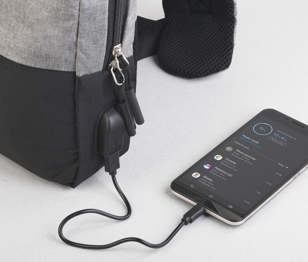 Сбоку расположена USB-розетка для подключения зарядных устройств, комплектуется кабелем USB/USB 60 см, мягкий карман для планшетов размером до 10 дюймов. Эргономичная спинка из дышащего материала и плечевой ремень с регулировкой по длине.