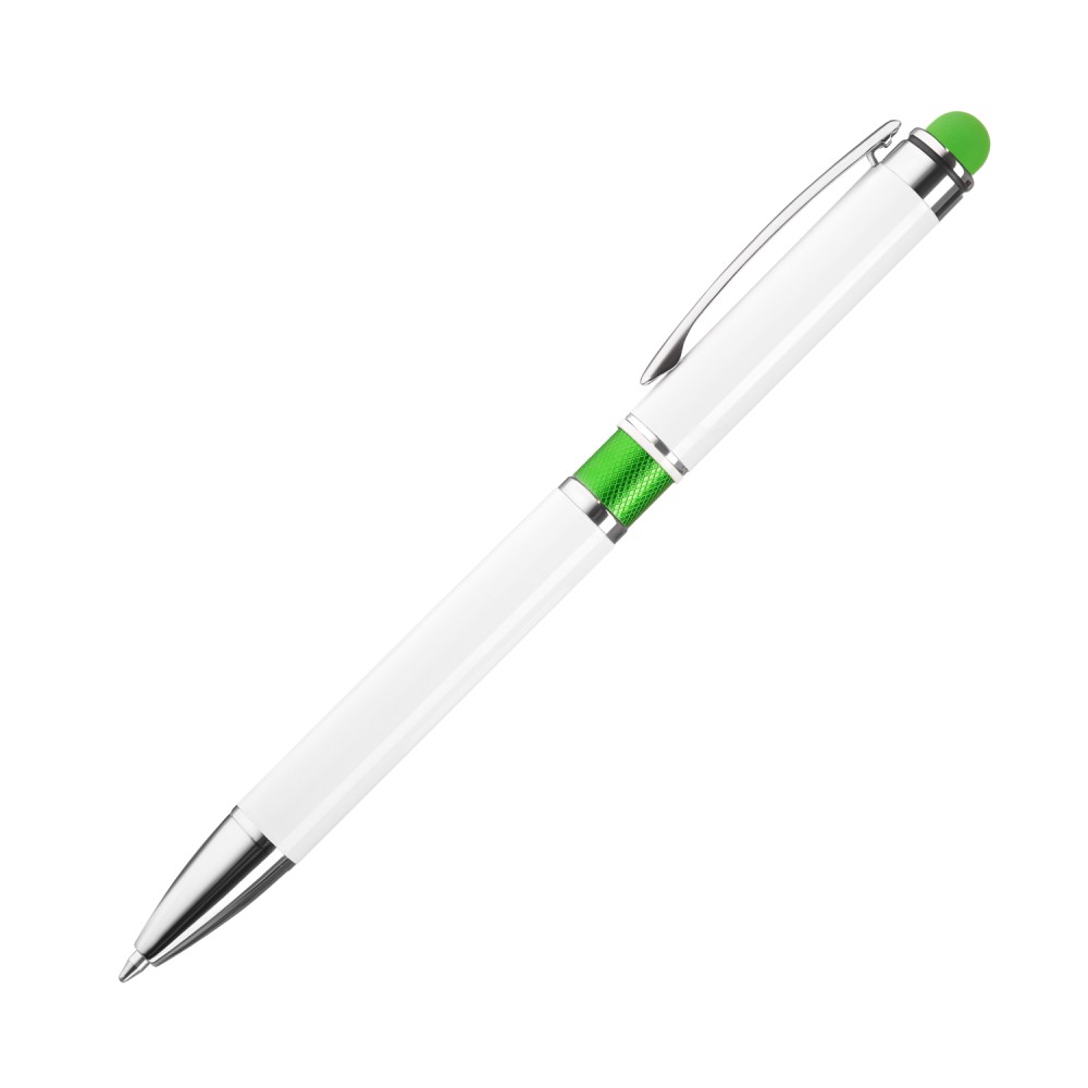 Алюминиевая ручка с белым корпусом, цветной вставкой и стилусом в цвет вставки.